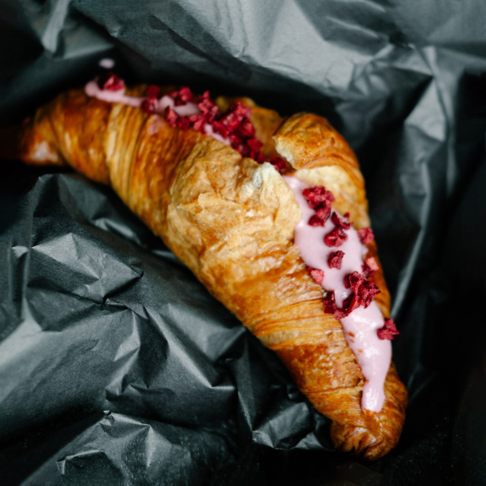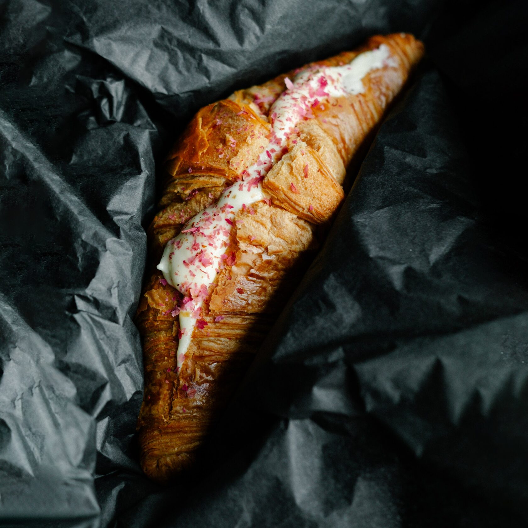 Эспрессо, молоко, лавандовый и земляничный сироп, листья розы